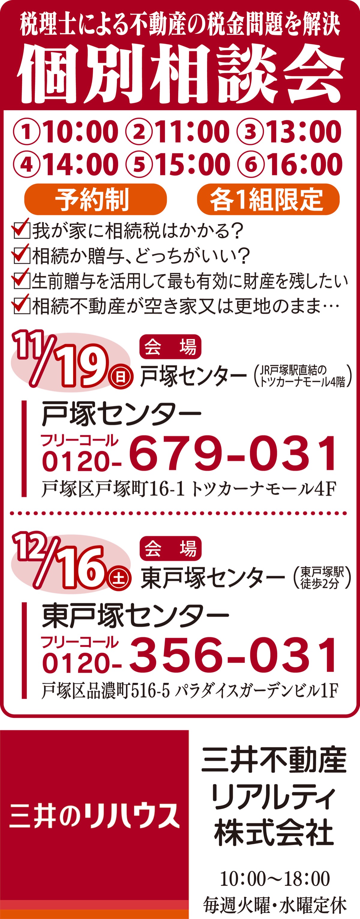 三井のリハウスの戸塚センターが11月19日(日)、東戸塚センターが12月16日(土)、不動産・相続専門の税理士を招いた個別の無料相談会を開催する=表参照。