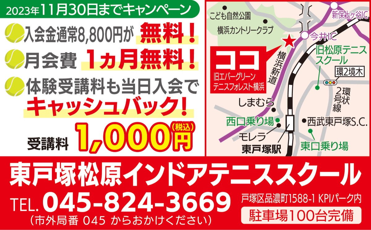 東戸塚で創業40年になる松原テニススクールが今夏移転オープンした「東戸塚松原インドアテニススクール」。旧スクール前と東戸塚駅西口(SAPIX看板前)、東口(トヨタレンタカー前)の3カ所で無料送迎バス(要登録)を運行しており、駅利用者や品濃町、平戸、境木方面からも通いやすいと好評だ。