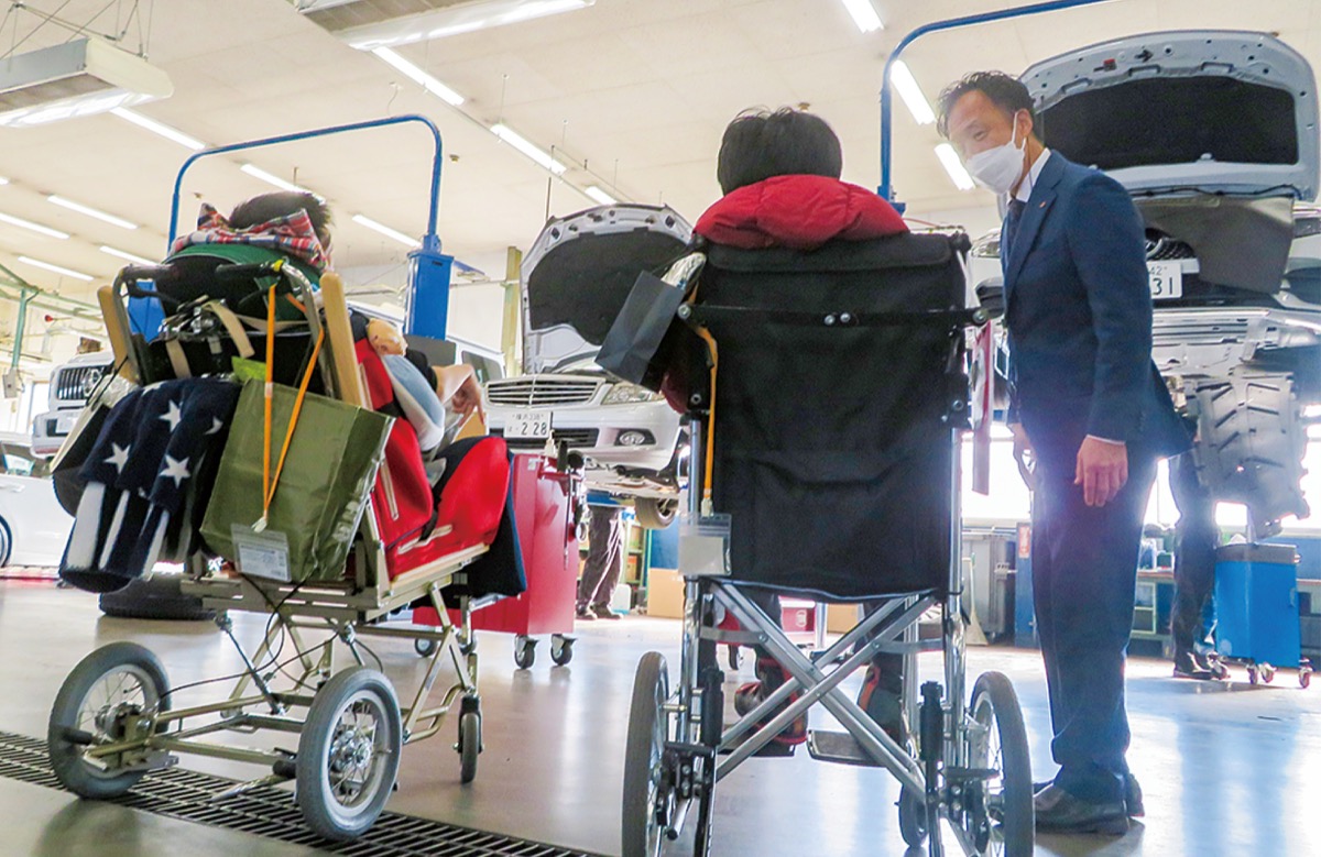 原宿にあるヤナセ戸塚支店はこの取組みに賛同、協力。11月30日、同校の高等部3年生の2人が同社を訪問した。
