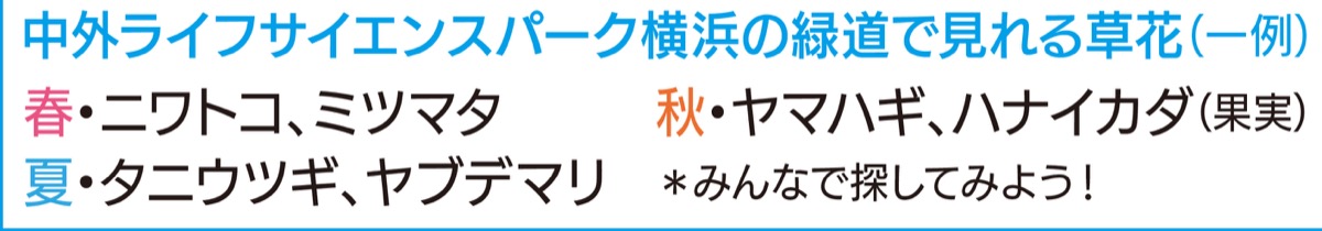 緑道を5つのゾーンに分け、区内周辺で見ることができる四季を感じられる草花(=表参照)や樹木を植樹。冬季は可愛らしい形状のドングリの実が転がっていたり、新芽の膨らみを楽しめたりする。製薬会社らしく、各種薬草を植えているのも特徴の一つ。名瀬谷戸の会・森林インストラクターと協働して、これらの植物の魅力を伝える自然観察会を定期的に行っている。自然災害対策も重視。降雨時に雨水を一時的に貯留して地下へ浸透させるレインガーデンの機能を緑道に持たせている。