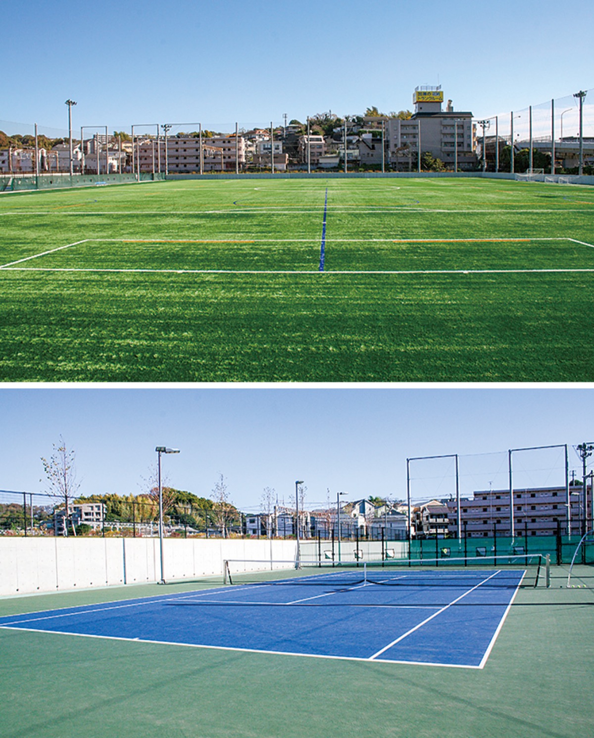 福利厚生施設として、JR線路側敷地にサッカーとラグビ―ができるグラウンドとテニスコートを整備している。区民であれば空き状況により利用が可能だ。