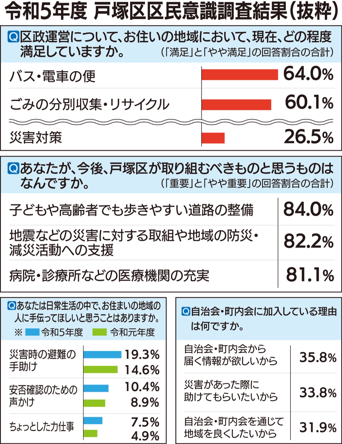 戸塚区役所は、昨年6月から7月に行った「戸塚区区民意識調査」 の結果を、12月26日に公表した。今後、区が取り組むべきと考えることについて、8割以上が「災害に対する取組や防災・減災活動の支援」と回答した。