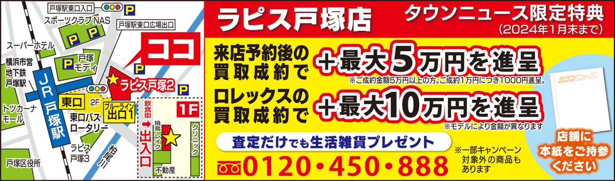 戸塚駅から徒歩約1分の「おたからやラピス戸塚店」では、ロレックスの買取強化キャンペーンを実施している。
