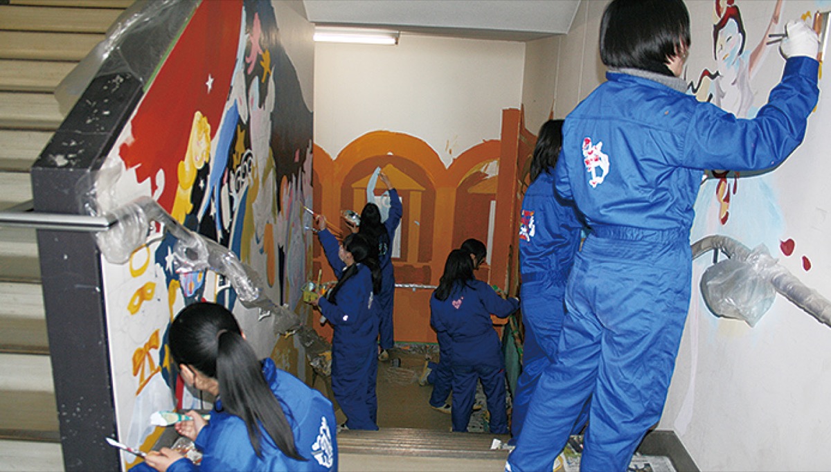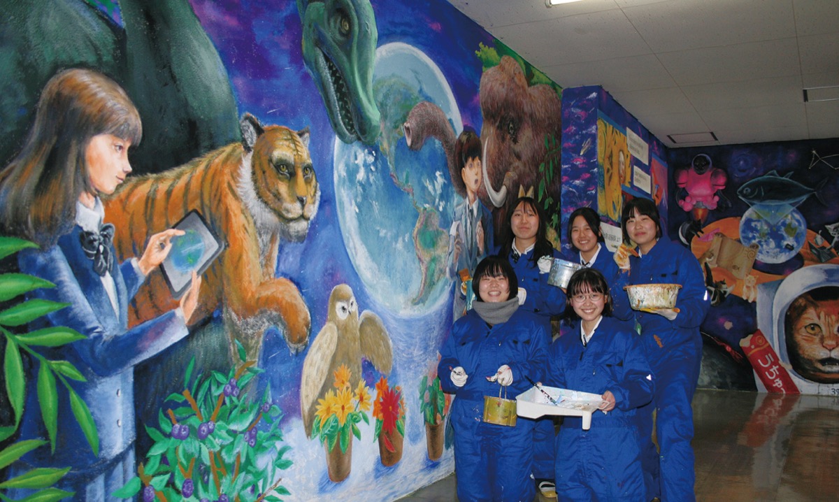 7年前に同校に開設された美術科。ここ数年、校内壁画アートは発展を続けているという。壁に絵を描いていた生徒の一人は「この壁画アートをやりたくて上矢部高校に入学した。先輩に負けない作品を残したい」と笑顔で話していた。