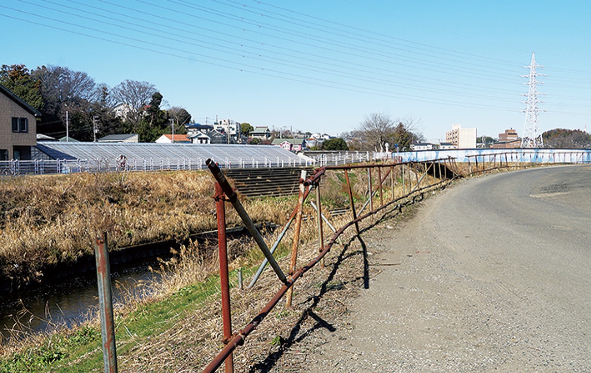 戸塚区俣野町と藤沢市の市境、俣野橋から境川遊水地公園へ向かう側道は抜道として交通量もある道路ですが、藤沢市側の河川沿い道路は歩道整備がされている一方、横浜市側は単管パイプで作られた簡易的な柵が設置されるのみで、車道と歩道の区別がない区間も存在し、危険な状態です。