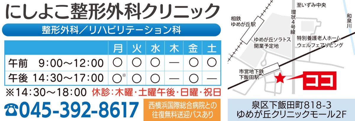 市営地下鉄下飯田駅前、ゆめが丘クリニックモールに昨年開院した「にしよこ整形外科クリニック」。戸塚区汲沢町にある本院の西横浜国際総合病院と連携し、診断から手術を含む治療、リハビリテーションまで一貫して行っている。