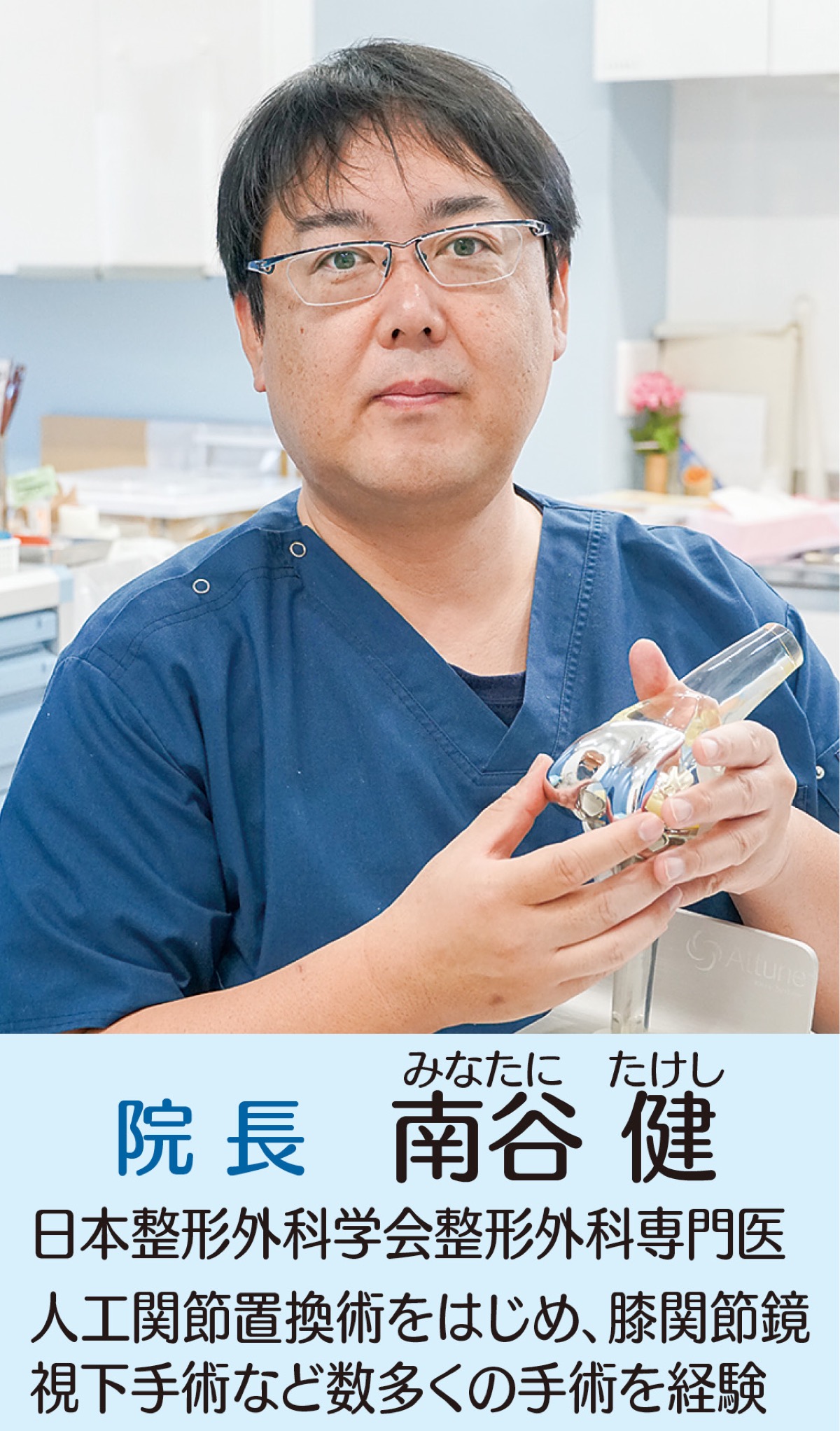 一般的なクリニックでは、精密検査や手術時には紹介状を持って、別の医師に診てもらう必要があるが、同院では本院で院長が担当。「退院後のフォローもクリニックで行うことで安心した治療が続けられます」。理学療法士が4人常駐しており、術後もスムーズに自宅生活が送れるよう支援する。南谷院長は「人生100年時代。地域の方に治療の選択肢を提案しながら健康寿命を延ばし、自立した生活を支えたい」と話している。