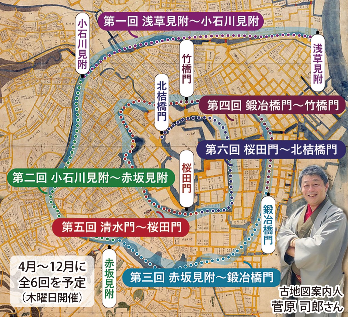 オーダーメイド旅行を提供し、20周年を迎える「旅人(たびゅ〜と)」が日帰りバスツアー「江戸見附・古地図さんぽ」(全6回)を企画。「知られざる江戸を楽しめる」と昨年大好評につきアンコール開催。初回はお試し価格だ。