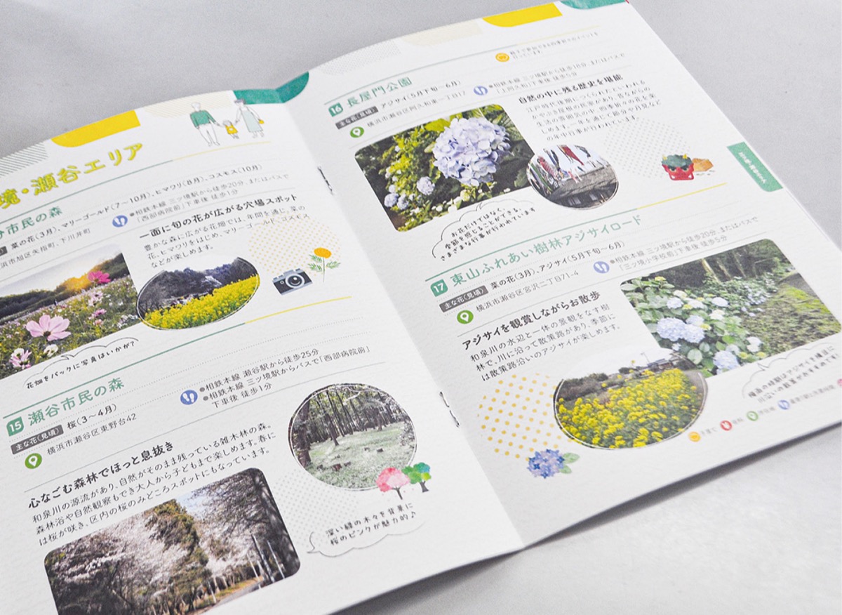 A5サイズで24ページ構成。沿線地域を「横浜・平沼橋」「保土ケ谷」「鶴ケ峰(里山ガーデン)」「三ツ境・瀬谷」「二俣川〜ゆめが丘」「羽沢横浜国大・新横浜」「新綱島・日吉」の7エリアに分けて、計33スポットを網羅。桜やチューリップなど季節ごとに楽しめる花と見ごろの時季を写真付きで紹介している。