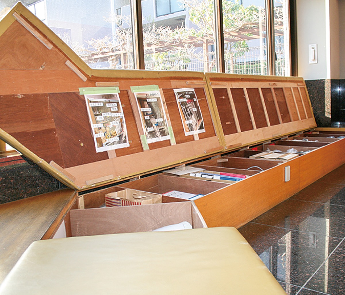 ファミール戸塚では、部屋番号、代表者氏名、食料必要数、支援の要否などを記入できる「支援物資調査票」を用意したり、エントランスにあるソファーの下の空間を活用し、なかに防災備蓄品を格納したり、防災備蓄庫を設置したりと準備を整えている。