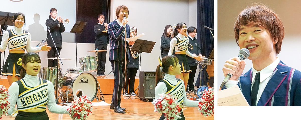 明治学院大学の新しい応援歌を、同大卒業生で東京スカパラダイスオーケストラのドラマー茂木欣一(もてぎきんいち)さんが制作した。戸塚区上倉田町の横浜キャンパスで3月26日、同大チアリーディング部やブラスバンド部などが、学生らの前で茂木さんと応援歌を初披露した。