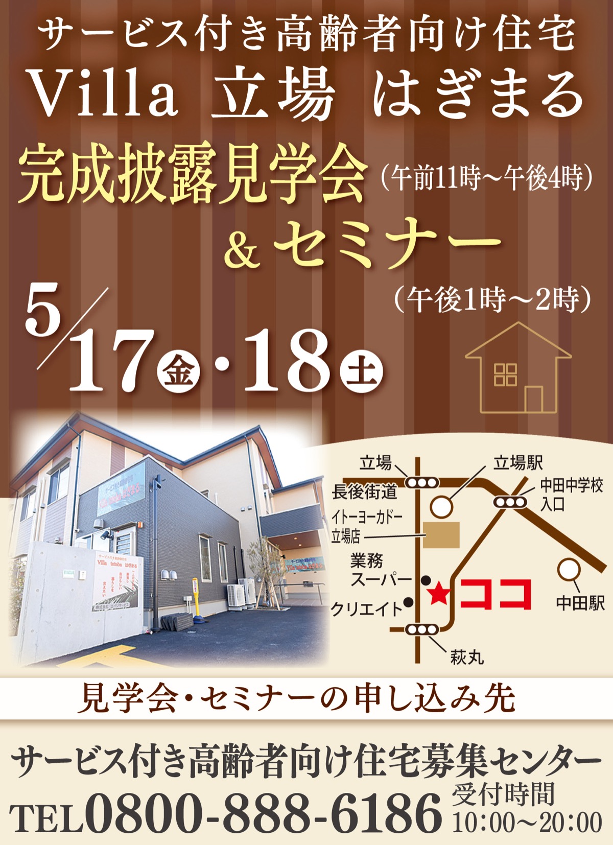 サービス付き高齢者向け住宅「Villa 立場 はぎまる」(泉区中田西1の20の3/(株)エイジサービス運営)で5月17日(金)と18日(土)の2日間、完成披露見学会が開催される。参加無料。各午前11時〜午後4時。事前予約制。立場駅からの送迎相談可能。