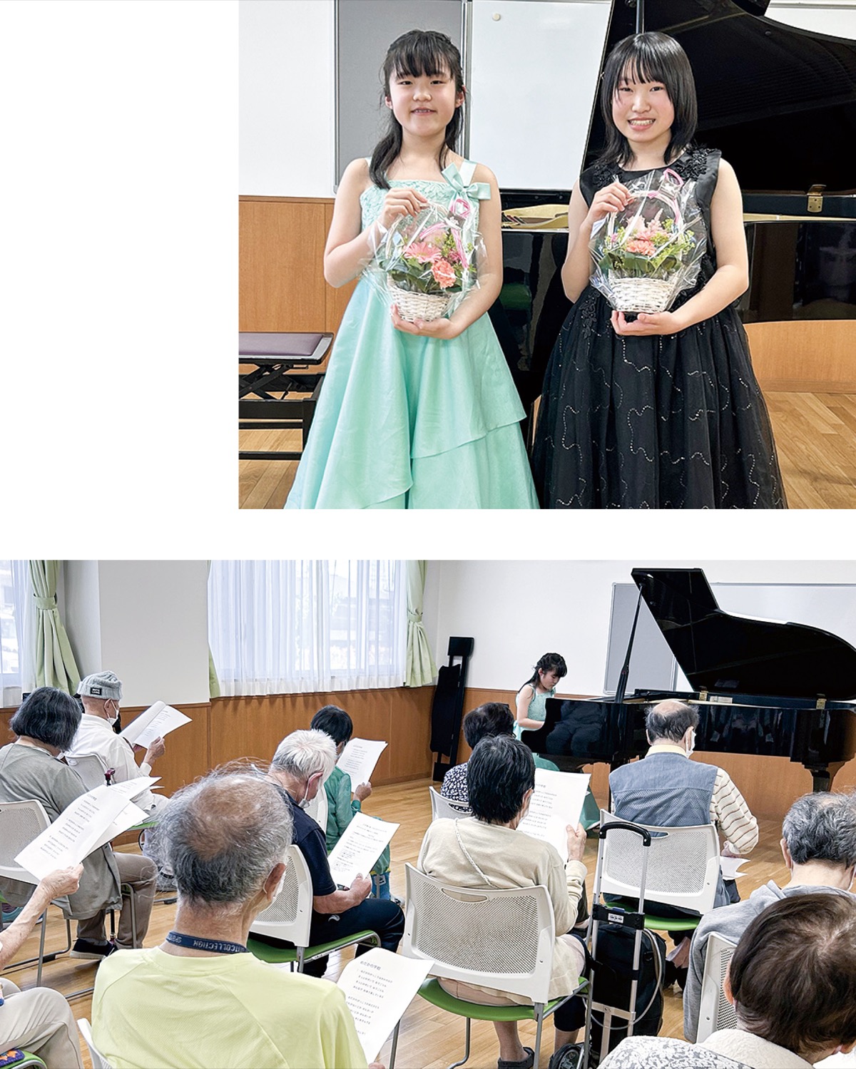 当日は、2023年のピアノコンペティション全国大会入賞者の三宅優璃さん(5年)、鬼木美嘉さん(6年)が登場。普段練習しているクラシックのピアノ曲、入居者たちが歌える童謡などを演奏し、入居者が合唱した。三宅さん、鬼木さんは「また来てね、ありがとうなどと声をかけてもらい嬉しかった」と笑顔で話した。入居者の一人は「昔、同じようにピアノが上手な同級生がいたことを思い出した」と懐かしんでいた。