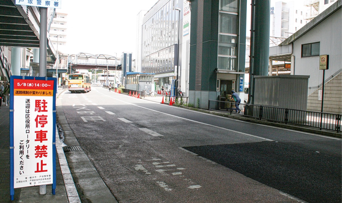 戸塚駅西口の駅前道路の一部区間が5月8日、駐停車禁止に指定された。一週間後の15日午前、現況を取材した。