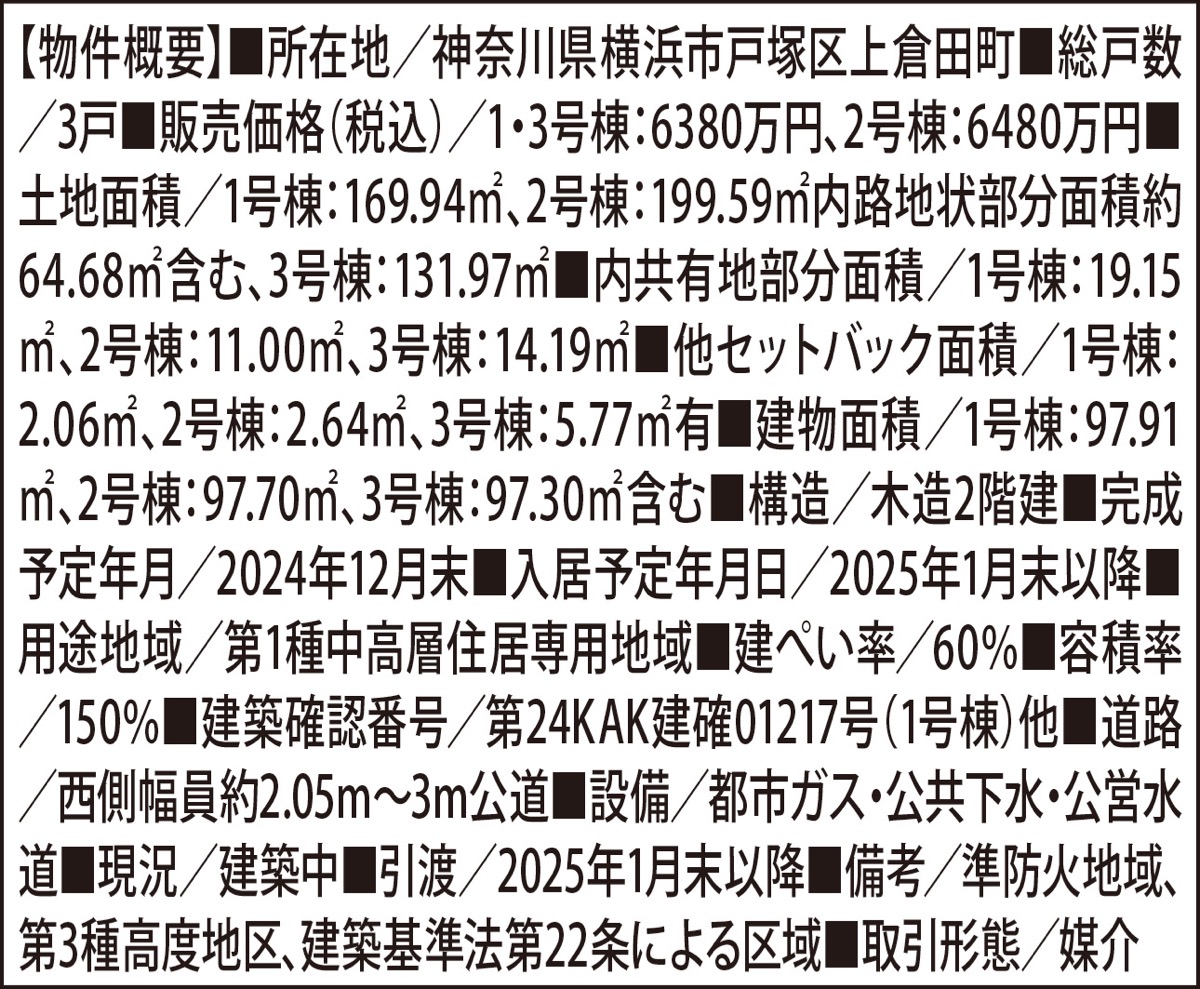 間取りは3棟全て4LDK。約2台停車可能なカースペースや、開放感のある天井が特徴。アクセスは各線「戸塚」駅徒歩13分に位置する。徒歩10分圏内にコンビニエンスストアや大型スーパー「アピタ戸塚店」がありアクセスは良好。「お住み替えが伴う方の売却もお手伝いします」と茂木店長。詳細は同店【フリーダイヤル】0120・938・173