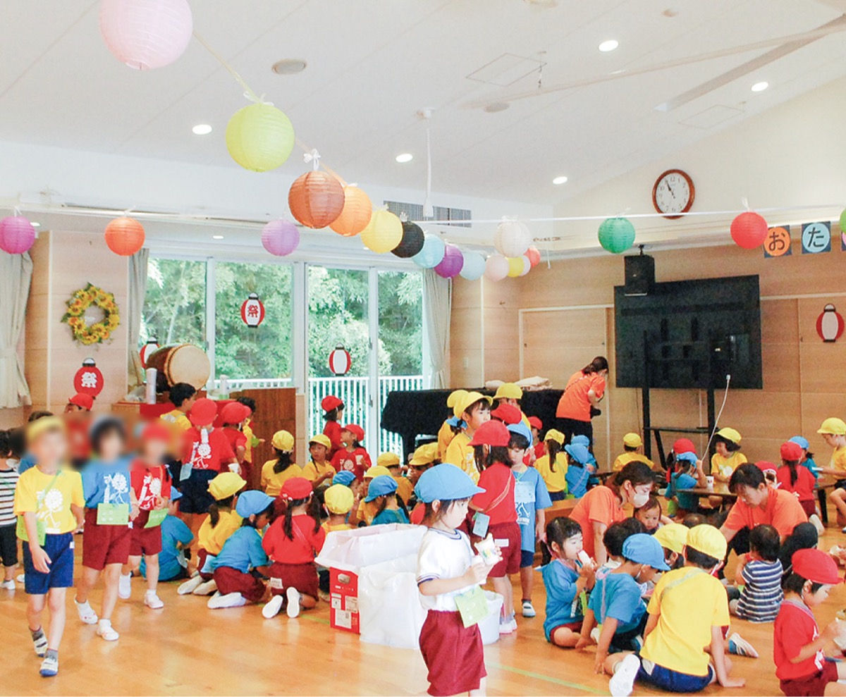 戸塚町の幼保連携型認定こども園・ひまわり幼稚園で7月18日、学年を超えて園児が楽しむ恒例の「おたのしみかい」が行われた。当日は、年少から年長までの縦割りで班を結成。園内各所に設置された的あてやヨーヨー釣り、おばけ迷路などのブースをスタンプラリー形式で巡った。