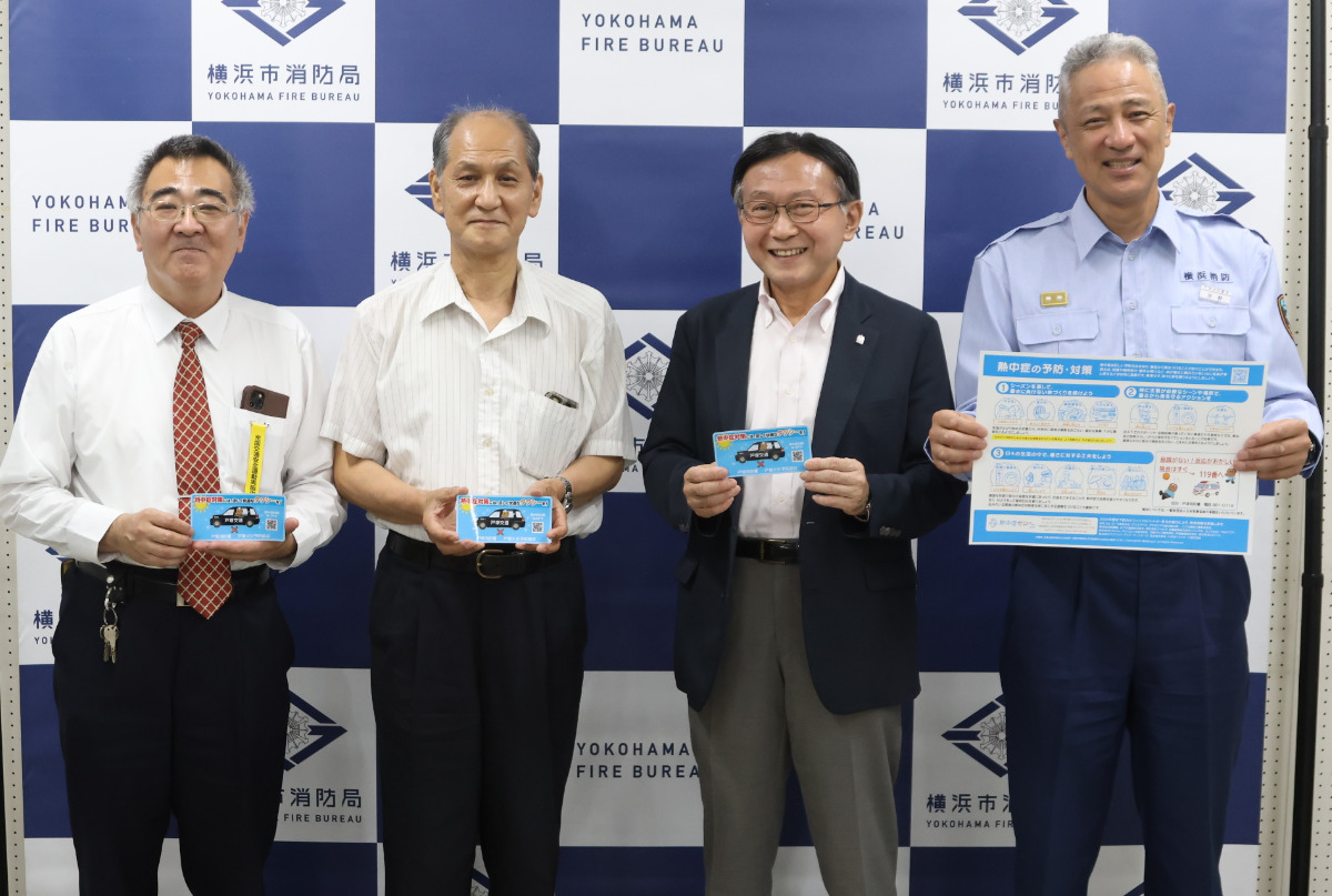 戸塚消防署からの相談に対して火災予防協会がステッカーの制作費を負担し、戸塚交通のタクシー計21台にステッカーを貼付。戸塚交通の山沖正代表取締役は「この暑さなので、少しの移動であっても気軽に利用してもらえたら」とした。