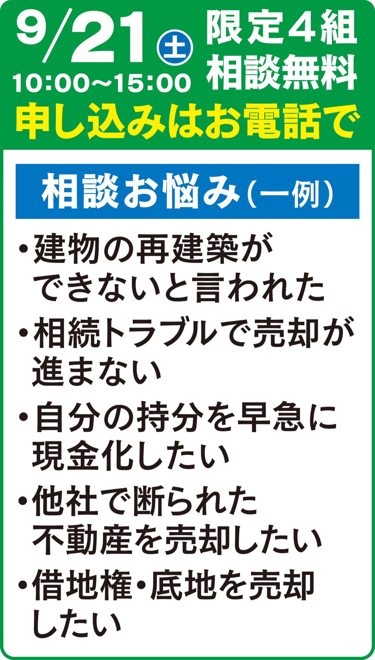 相鉄不動産販売・緑園都市店では9月21日(土)、共有持分・共有名義・訳あり不動産に関する無料個別相談会を開催する。相談は訳あり不動産の買取りに特化した専門家が対応する。「今まで悩んでいた問題が解決できた」など、参加者から好評の相談会だ。「共有で不動産を所有しているが、共有者の同意が得られず売却できない」「自分の持分を早急に現金化したい」などの訳あり不動産に関する様々な問題を1組50分間、じっくり相談できる貴重な機会。限定4組(予約制・先着順受付)。予約は電話で。気軽に相談を。