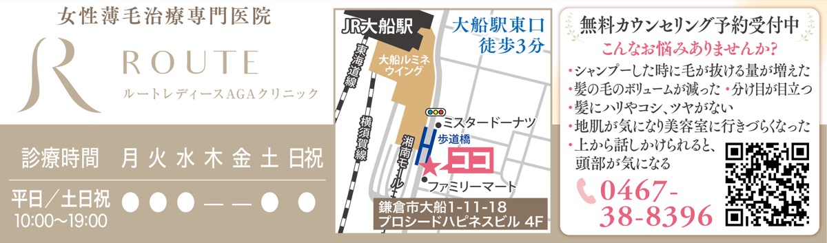 大船駅から徒歩3分の「ルートレディースAGAクリニック」は、女性に特化した薄毛治療院。同院には毛髪の専門医と診断士が在籍し、症状に寄り添った診療と親身な対応が、薄毛に悩む女性から好評を博している。