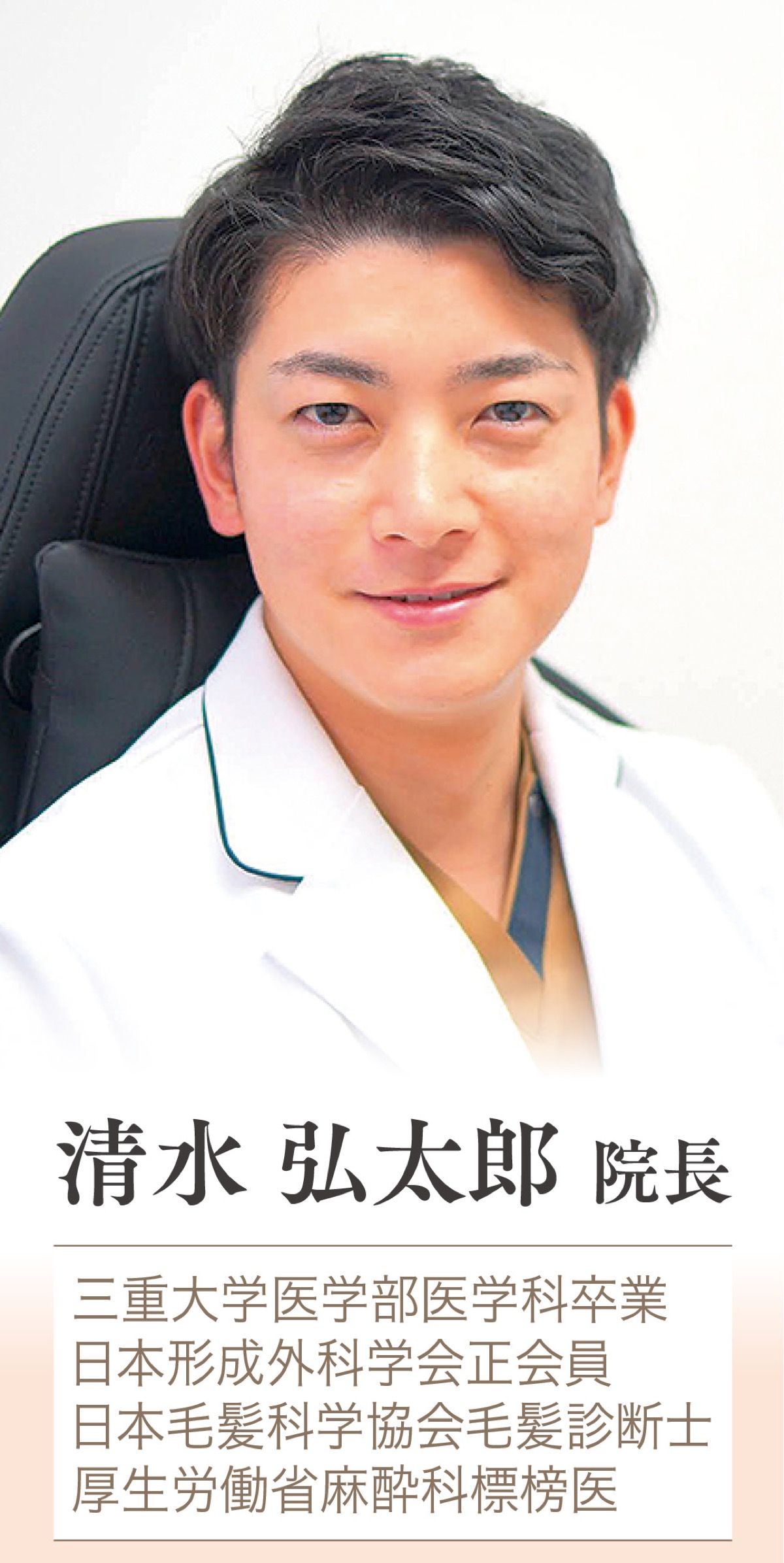 「薄毛は進行性の病気のため、毛根が死滅する前に適切な治療が必要」と話すのは、清水弘太郎院長。薄毛の原因は、ホルモンバランスの乱れや過度なダイエットによる栄養不足、頭皮環境の悪化などさまざま。清水院長は、「原因を突き止めるには医師の診断が重要です」と言及する。