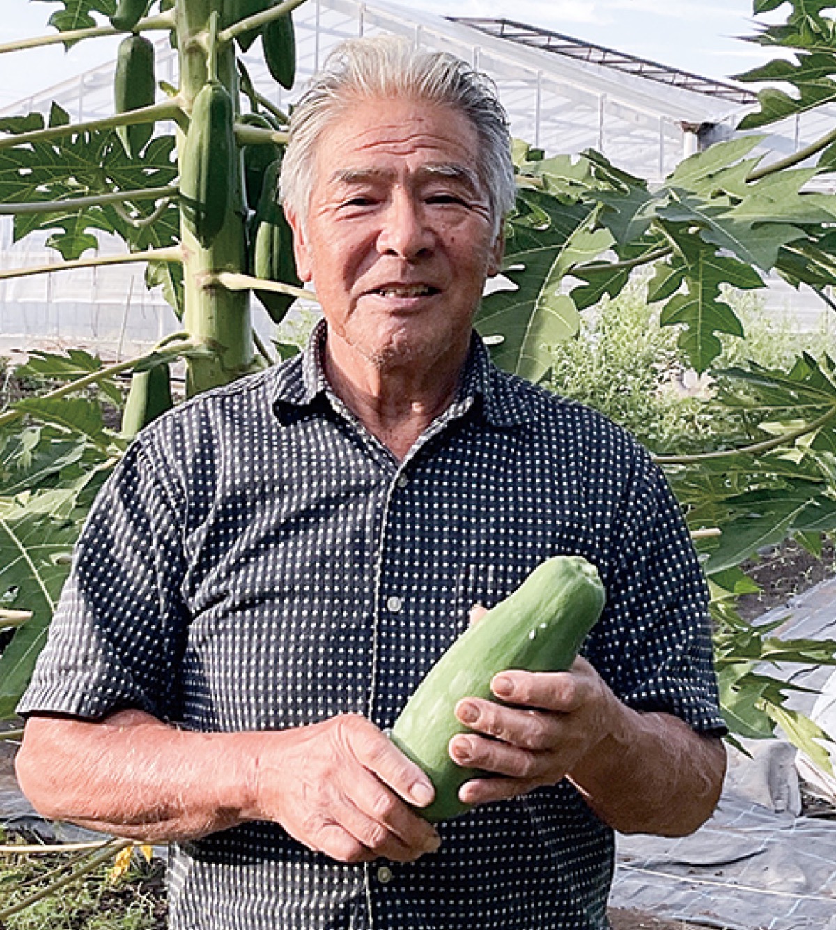 同キャンプ場を管理する美濃口俊雄さんは「温暖化の影響もあって、横浜でもすくすくと青パパイヤが育ちました。とても美味しいのでお気軽に体験しに来てください」と話す。問合せは美濃口さん【携帯電話】080・6710・3297へ。