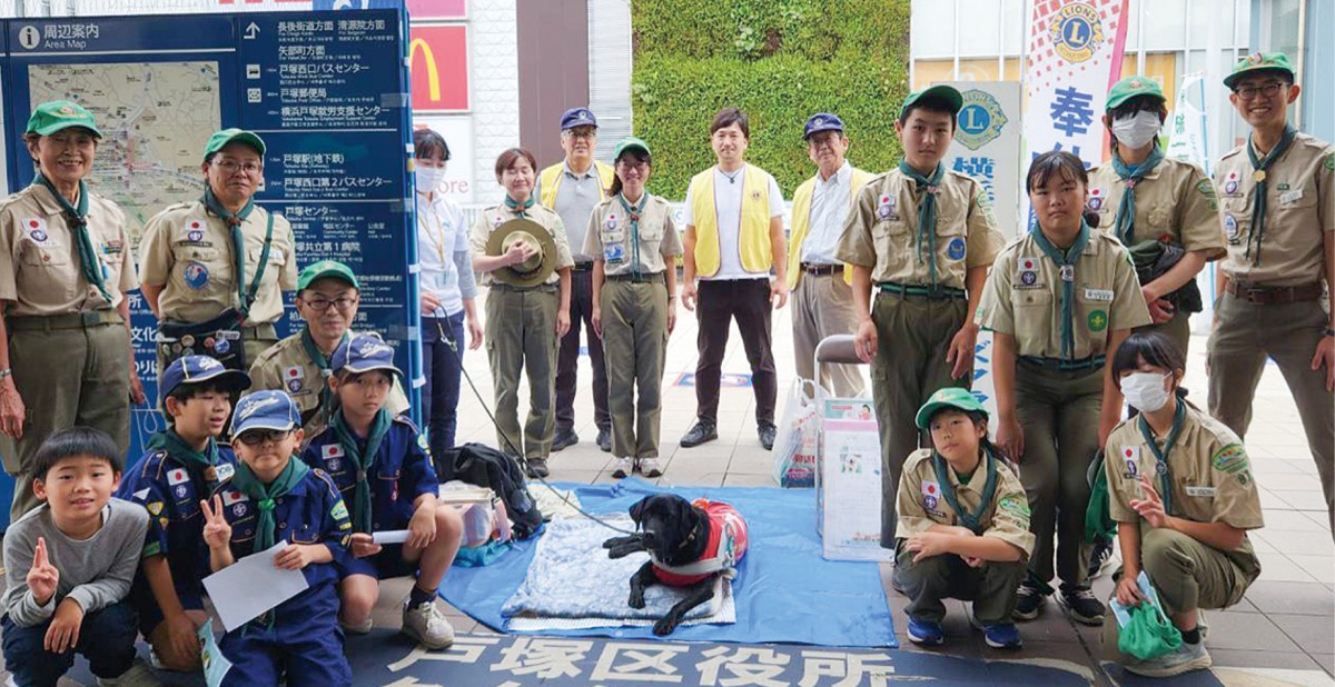 LCの記念日である10月8日の「ワールドライオンズ奉仕デー」に先駆けて行われた活動。クラブのメンバー5人と日本盲導犬協会2人と同協会の訓練犬1頭に加え、ボーイスカウトの団員15人も協力した。