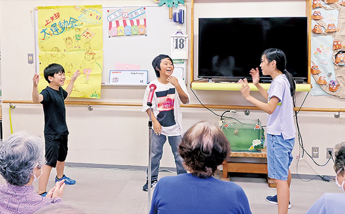 上矢部小学校5年4組の児童たちが10月17日、18日の2日間、上矢部地域ケアプラザを訪れ、デイサービス利用者の前で漫才を披露した。