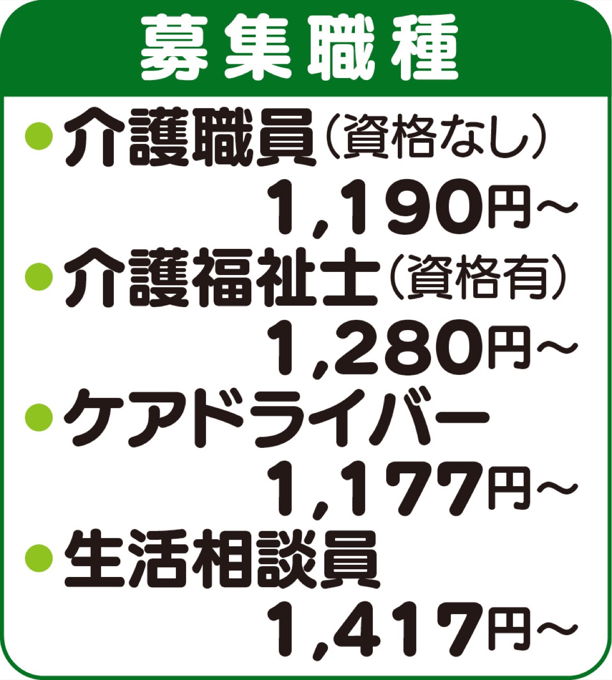一緒に働いてくれる人も募集中(表参照/勤務時間は応相談)。高齢社会を支える意義深い仕事にチャレンジを。