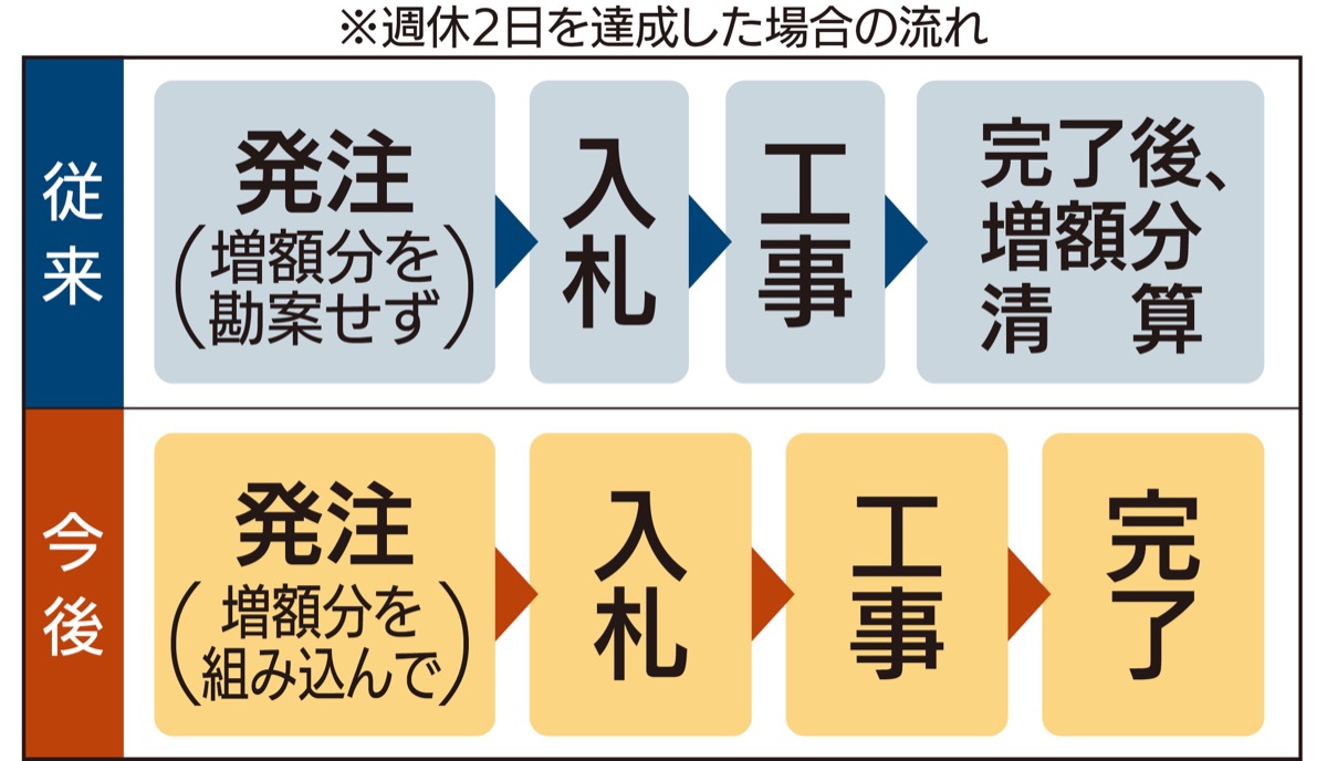 さらに来年度早期をめどに、発注方法自体も見直す方針だ。週休2日を確保することで工期が延びると、機械の賃料や現場管理費、労務費が以前より必要になる。従来はこういった増額分について市は、予算に計上しつつも発注段階では組み込まず、工事完了後に実態を確認した上で清算する流れだった。今後はこの増額分を発注時点であらかじめ組みこむという。