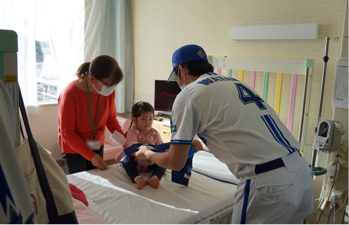 同病院を訪れた山崎選手は「応援してくれている人たちに勇気とエネルギーを与えられるよう頑張りたい」と語り、度会選手は「子どもたちが頑張る姿を見て、自分ももっと頑張らないといけないと思った」とコメントした。