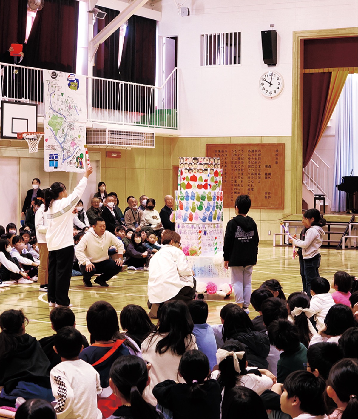 記念行事は児童が進行し、1、2年生によるお祝いの歌でスタート。全校児童が作り上げたケーキがお披露目されると、会場はお祝いムードに包まれた。