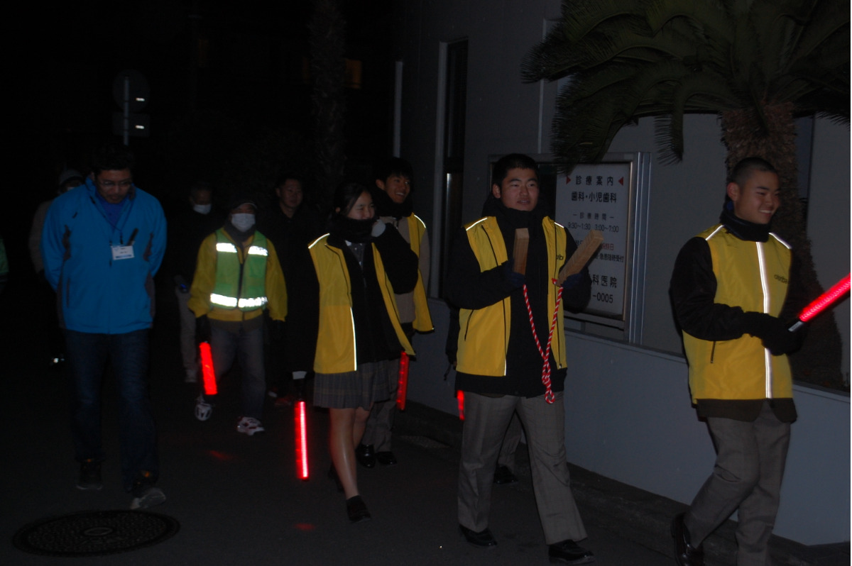 同校2年の男子生徒は「詐欺や盗難がなくなってほしい」と思いを込めて拍子木を打ちながら、大きな声で「火の用心」を呼びかけた。