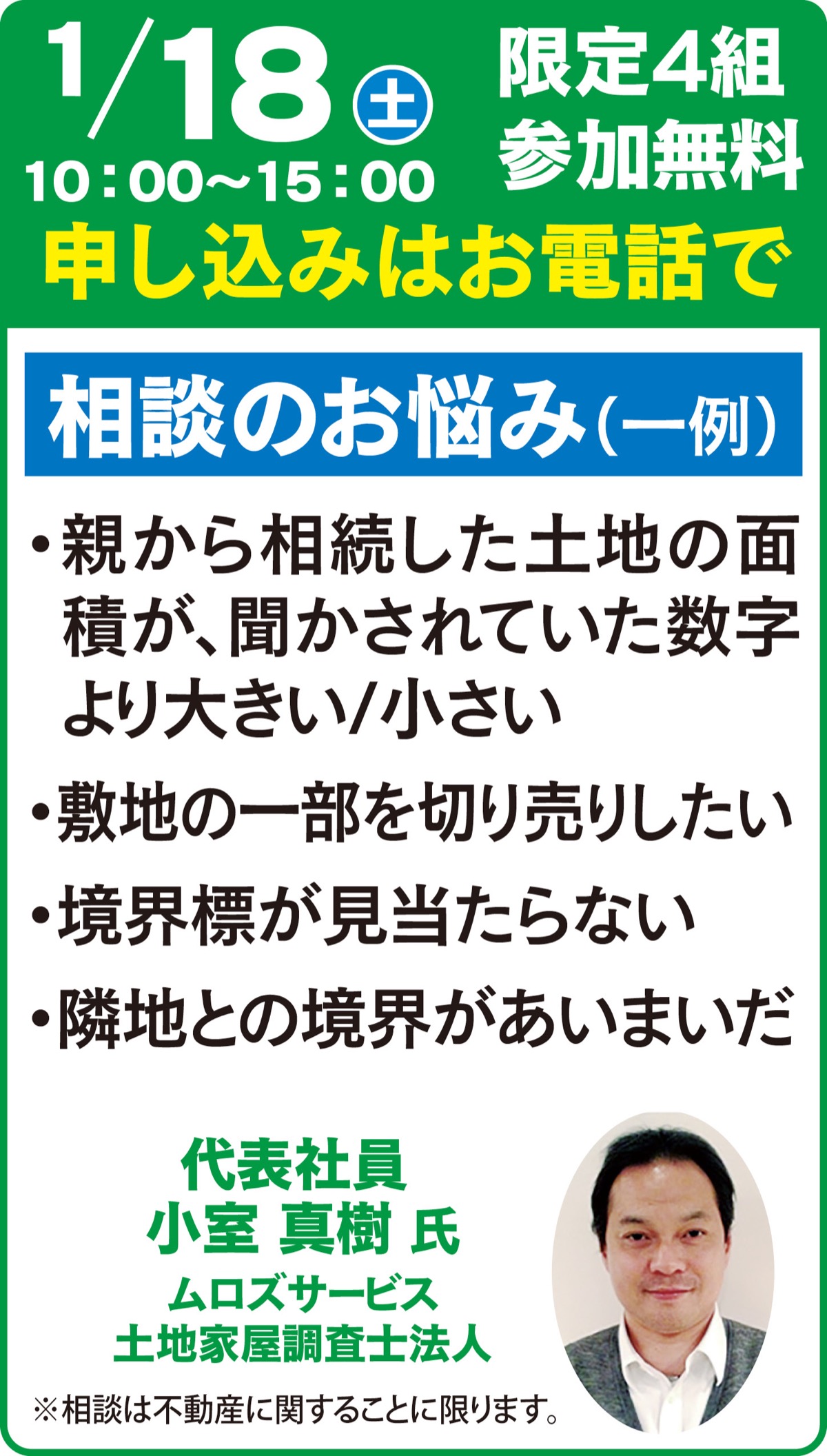 「境界標がない」「隣地との境界があいまい」「親から聞いていた面積と現況面積に相違がありそうだ」「敷地の一部を切り売りしたい」など、所有する土地の様々な疑問や悩みを、1組50分間、じっくりと相談できる貴重な機会だ(予約制・先着順受付)。予約は電話で。