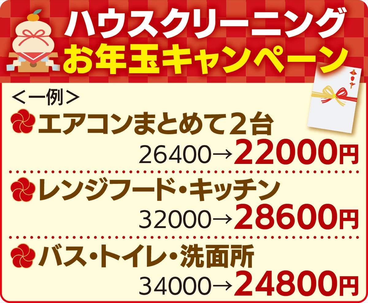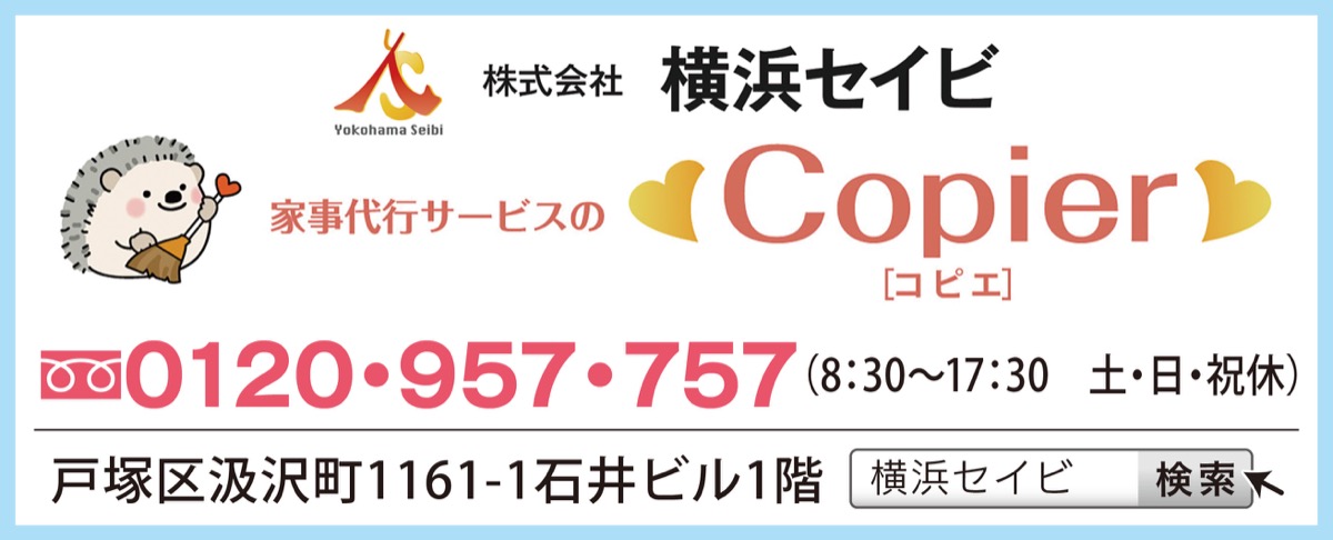 「年末は忙しかったので大掃除があまりできなかった」――。そんな人をサポートしようと、戸塚区汲沢町の(株)横浜セイビが展開する家事代行サービスの「コピエ」は、ハウスクリーニングのお年玉キャンペーンを実施。エアコン、レンジフード・キッチン、バス・トイレ・洗面所などは掃除の大変な部分をプロがしっかりピカピカに。「従来のキャンペーンよりもお得です。お年玉価格なのでこの機会に」と呼びかけている。