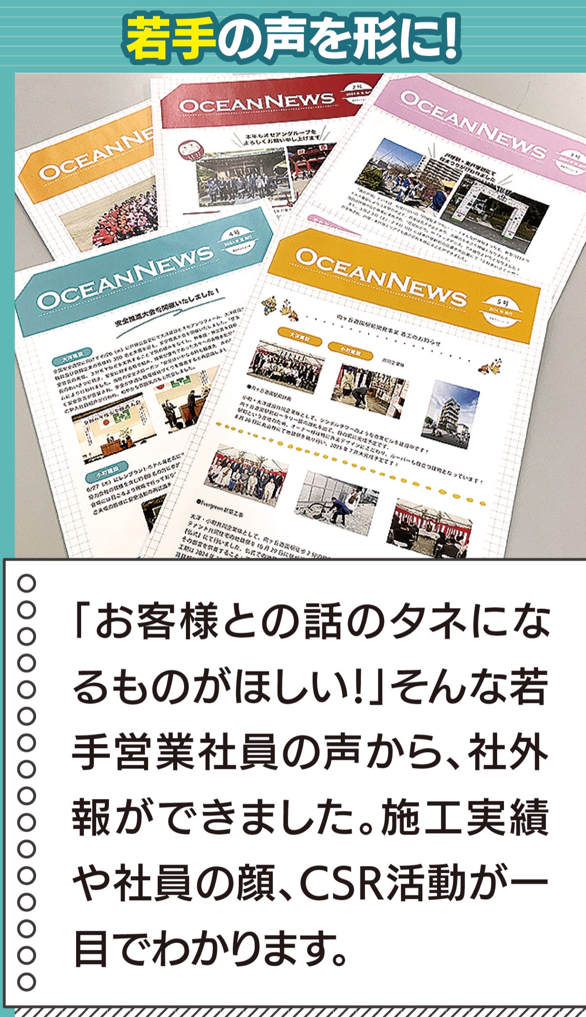 2人はインターンシップの準備や面接官、中学生向けの職業講話などを通して、次世代を担う仲間を募っている。「大洋建設じゃなくても、業界全体に関心を向けてもらうことが大切」と視野を広く、将来を見据える。