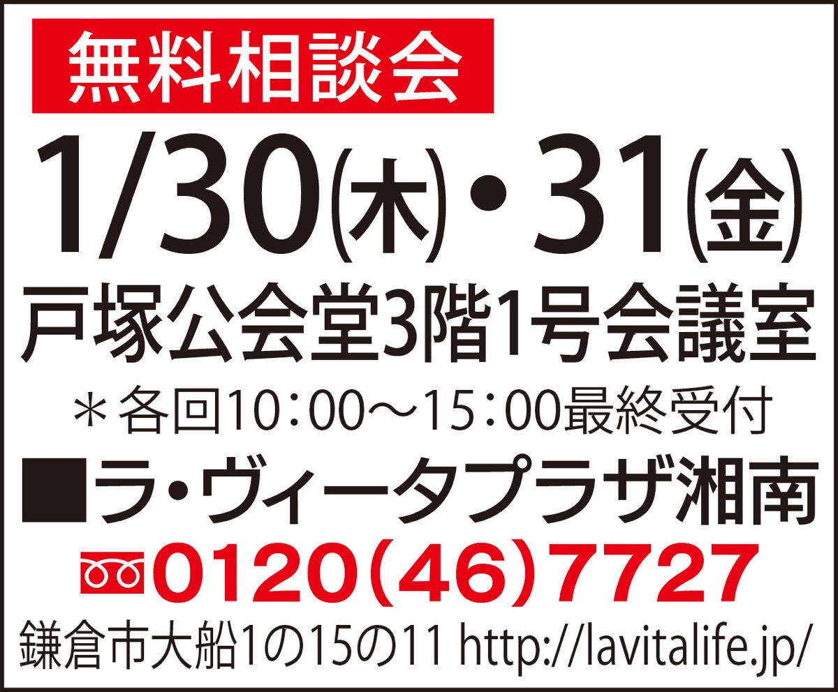 有料老人ホームや高齢者住宅など各種施設を、第三者の立場で紹介する「ラ・ヴィータプラザ湘南」による「無料相談会」が1月30日(木)・31日(金)、戸塚公会堂(戸塚駅西口徒歩5分)で開催される。予約不要。午前10時から午後3時最終受付。相談は1組1時間程度。