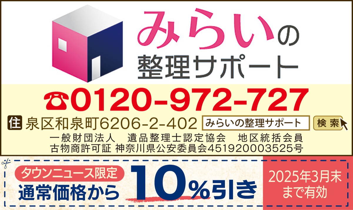 「自分たちでは部屋の整理ができない」「親が亡くなり家の整理をしなければいけない」「このご時世、よく知らない業者に頼むのは不安」と悩む人に朗報。遺品整理や部屋の片づけ、不用品引取などは戸塚区、泉区を中心に横浜市内に地域密着で活動する「みらいの整理サポート」に相談してみては。