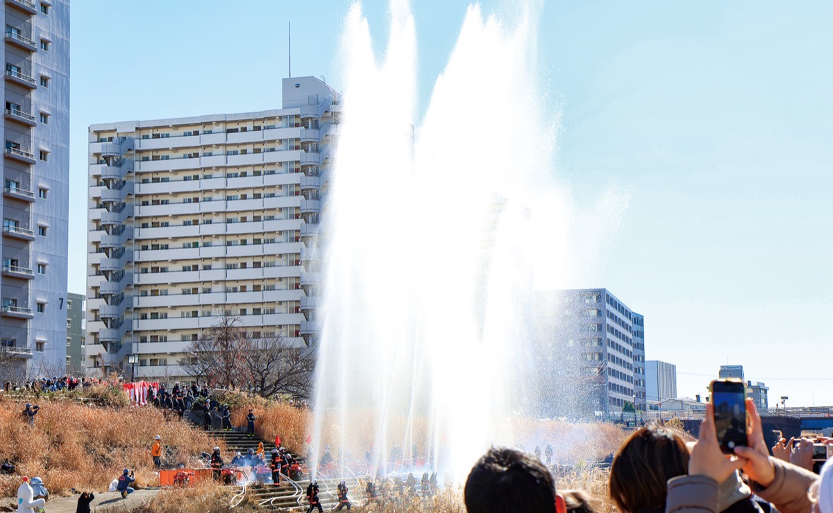 また一斉放水時には迫力ある水柱に観客の歓声があがり、さらに市消防局のヘリコプターが通過飛行して盛り上げた。