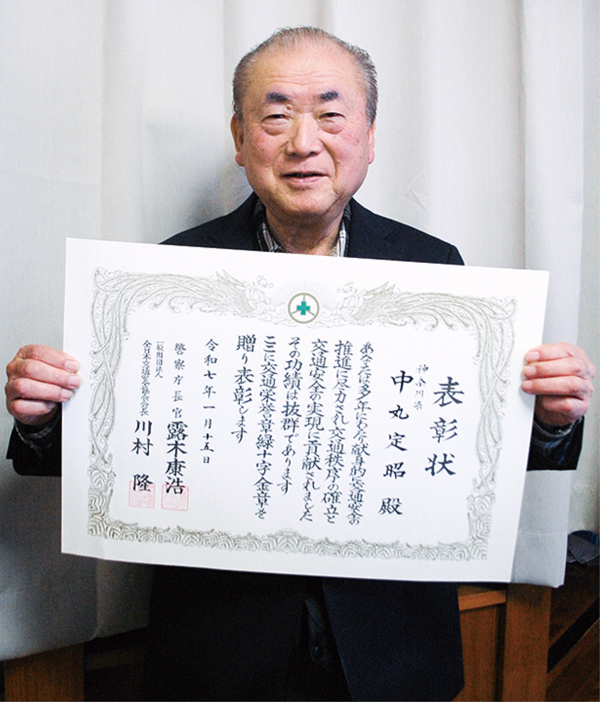 中丸さんは長期にわたって交通安全協会の副会長を務め、現在も会計監査として尽力。活動歴は45年以上にもなる。「受章するとは思わず驚いた。交通安全が守られれば、犯罪抑止などにもつながるはず」と中丸さんは話した。