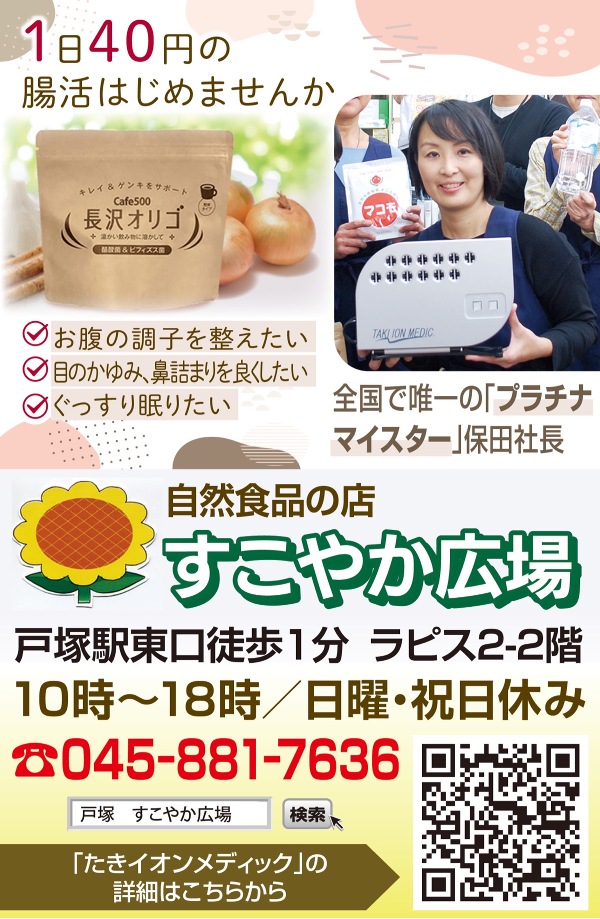 戸塚区で創業50年以上の自然食品店「すこやか広場」。花粉で辛いこの時期は「『たきイオンメディック』で、生活環境から対策してみては」と保田亜紀子社長は話す。