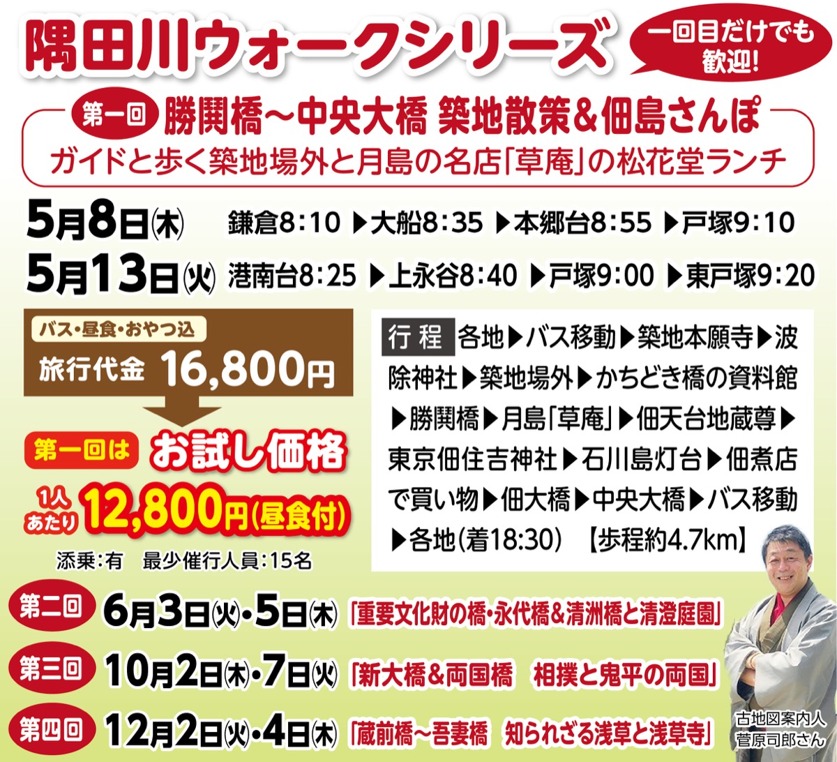 オーダーメイド旅行を提供する「旅人(たびゅ〜と)」が日帰りバスツアー「隅田川ウォークシリーズ」を企画(全4回)。「知られざる江戸を楽しめる」と好評を博した「江戸古地図シリーズ」の新企画だ。