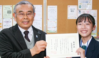 地域で開かれるイベントの支援を、区内在住の小学4年生から中学3年生が担う「泉わくわく応援隊」。参加するごとにポイントシールがもらえ、枚数に応じて景品がプレゼントされる。3月15日、和泉中央北にある「いこいの家」で最高枚数を獲得した、中和田中学校1年生の嵯峨野琴美さんに、泉区社会福祉協議会の貝沼貞夫会長が表彰状を手渡した。