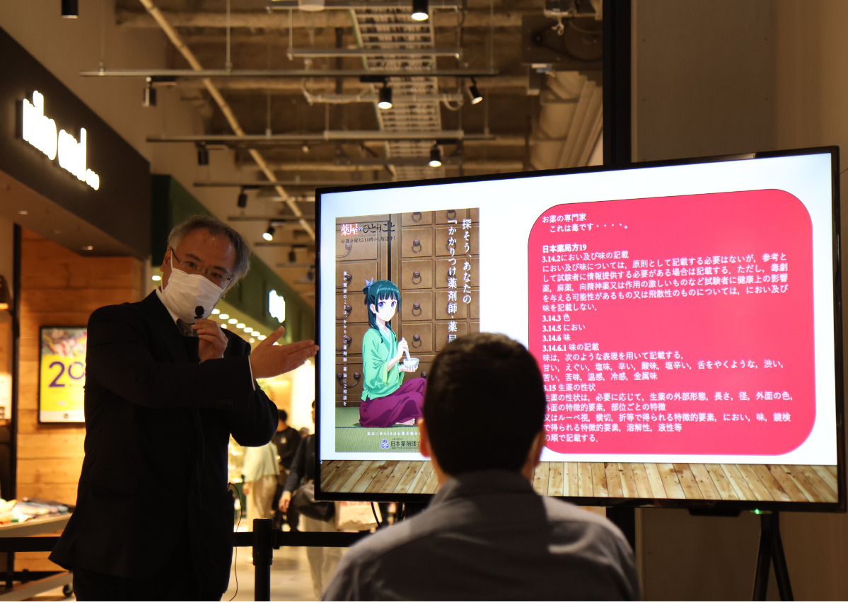 また1階のライブキッチンソラトスでは横浜薬科大の吉江文彦准教授による市民公開講座も実施=写真。吉江准教授は「薬は治すわけではなく、身体が治すのを助けるもの」など薬に関する基本的な話のほか、かかりつけ薬局を作るメリットなどについて話した。
