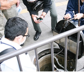 戸塚駅では西口・東口ともに2カ所、計4カ所のマンホール内に水位計を設置した。いずれも地下道街に隣接している。3月26日・27日に市は、駅周辺の商店街関係者らを対象にした水位情報システムの活用方法などの説明会を区役所で開催した。その後、実際に設置された西口交番前のマンホールに移動し、見学をした。