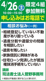 相鉄不動産販売・緑園都市店では、司法書士事務所による相続・不動産登記の無料個別相談会を4月26日(土)に行う。「今までの問題が解決できた」など、参加者から好評の相談会だ。相談を受けるのは司法書士法人菅野事務所。昨年4月1日から施行された相続登記義務化により、同事務所への相談が増えている。相続登記を中心に相談を受け付けている。過去の相続発生時に相続登記が未了であるケースや、相続でもめないための備えなど、1組50分間、じっくりと相談できる貴重な機会。限定4組(予約制・先着順受付)。