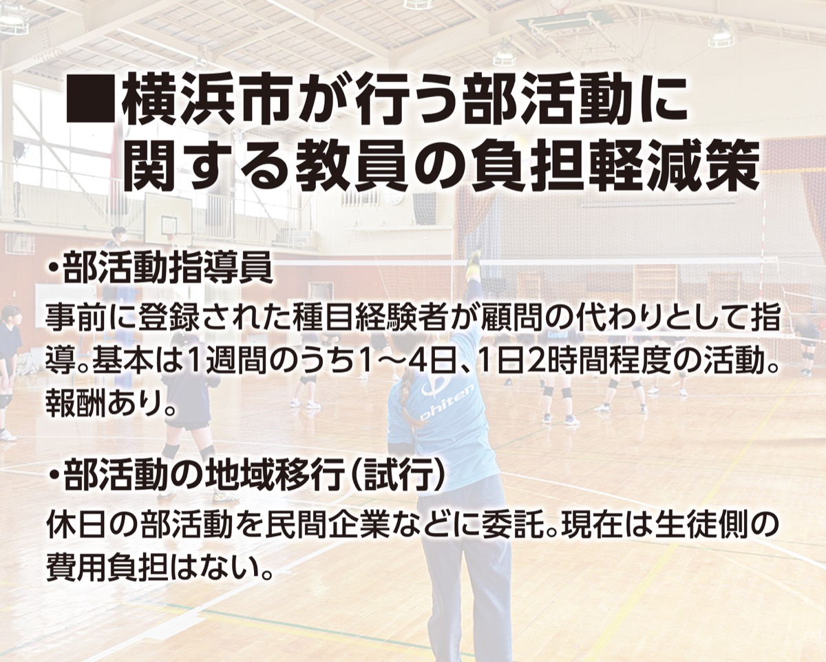 市教委は、いずれの制度に対しても「生徒や保護者から『経験のある人に指導してもらえる』との声が出ている」という一方、「教員ではない人が指導することに不安を覚える人もいる」という。さらに、技術だけではなく、教育的な視点での指導が必要なことや、活動中に個人情報が多く置かれている職員室や保健室に外部指導者がどこまで入室できるかなど、課題も多い。市教委は「課題は年々改善されている」と各校でルール整備が進んでいるという。