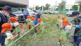 平和幼稚園(泉区和泉中央北/安西透園長)の年長園児43人が6月12日、泉警察署を訪れて七夕飾りを寄贈した。20年以上続く恒例の取り組みで、毎年園児たちお手製の飾りが泉署の入り口に飾られる。