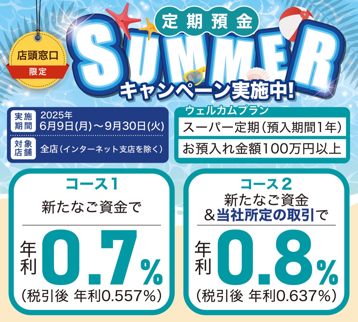 同キャンペーンは店舗窓口で、【1】新規で100万円以上をスーパー定期(預入期間1年)に預け入れると、年利0・7〜0・8%の特別金利が適用されるウェルカムプラン、【2】預入10万円以上対象のサンクスプラン【預入期間最長5年、最大年利0・8%(税引後年利0・637%)】を用意。