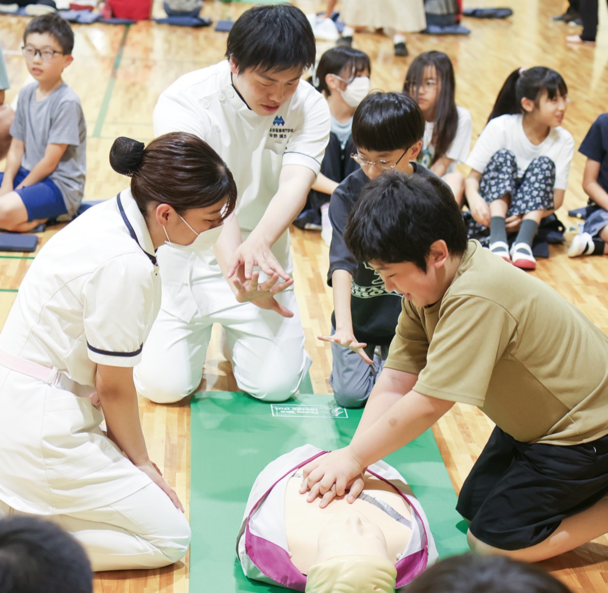 さらに各クラスごとに学生がつき、児童に心臓マッサージの手順を指導。児童は適切な手の形や位置、テンポなどを教わり、人形を使って体験した。