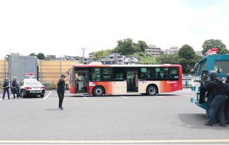 訓練では、拳銃を持った不審者役の警察官1人がバスを占拠。神奈中の従業員が通報し、駆け付けた警察官が取り押さえた。不審物による体調不良者の対応のため、救急車も駆けつけ、テロ対応専門部隊も連携した緊張感のある訓練となった。